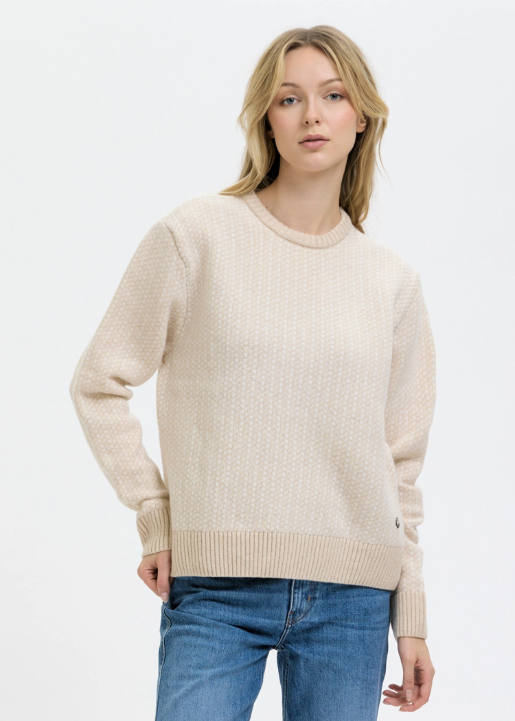 Varje skärgårds-vistelse kräver en fiskartröja. Här är vår damversion av denna klassiska småmönstrade tröja i färgen off-white och beige. Tidlös design tillverkad av 100% merinoull, ull värmer, andas och håller dig bekväm oavsett väder. Passformen är lös och tröjan har breda muddar vid ärmslut och nedtill.