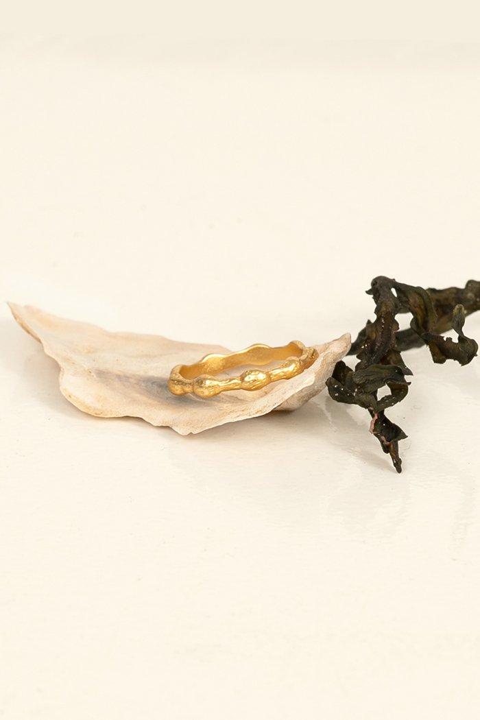 Ringen är inspirerad av en tångruska som vi upptäckte på Käringön. Den är pläterad med 18K guld och finns även med matchande armband och örhängen. Vår smyckeskollektion är designad på Käringön, där vi hämtar inspiration från den svenska skärgårdens naturliga skönhet. Alla våra smycken tillverkas för hand i en liten smyckesfabrik i Bangkok, som drivs av kvinnor och fokuserar på att främja jämställdhet och sociala rättigheter.